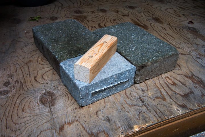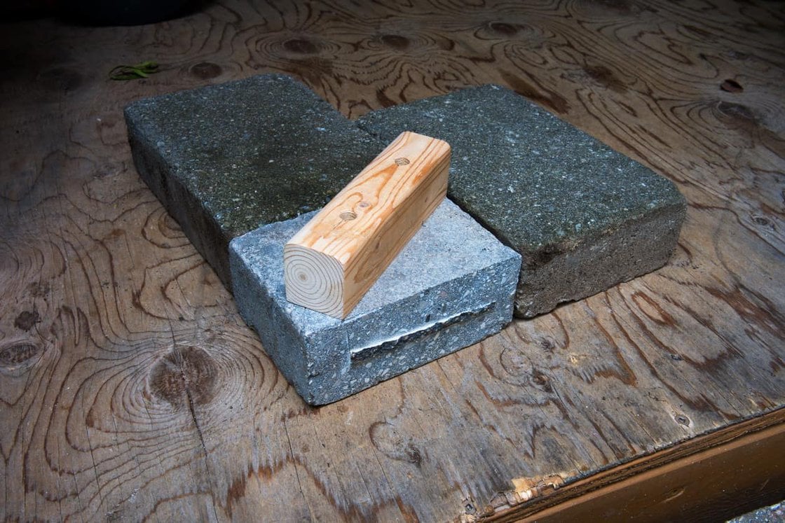 Luckily, I had a number of spare stones, although I couldn’t find a half stone anywhere – or, at least, I didn’t find one until after I had cut a full stone in half! My handle came from the scrap bin, and was a short piece of 2×4 that had been cut in half lengthwise. That gave it a flat face to mate with the stone and a nicely rounded face to fit in my hand.