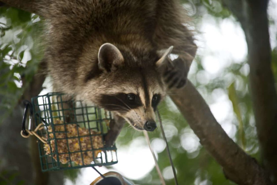 So here we are with a temporary truce. So long as the squirrels only get to the feeder with a supreme effort (and provide us with entertainment) we don’t mind the odd incursion. However, as you might have gathered from the blog photo, there has been a new development – a racoon in broad daylight. While I’ve seen the results of a racoon hauling the feeder up into the tree the next morning, I’ve never seen how they do it, and reaching around the coffee can while clinging to a branch and not letting go of the wire is quite an achievement.