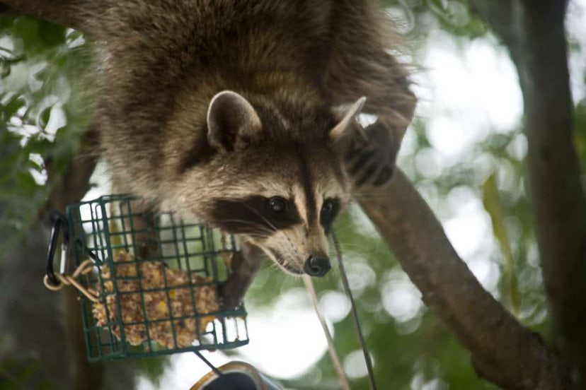 That pretty much holds the squirrels at bay, but the racoons still manage to haul it up. However they operate at night, so I added a carabiner and I bring the actual basket in at night now. Unfortunately a nearby branch recently grew sturdy enough for squirrels to get close and jump to the basket so I cut off part of the branch leaving only the flimsiest of twigs, but some of the flimsier squirrels still venture forth occasionally.