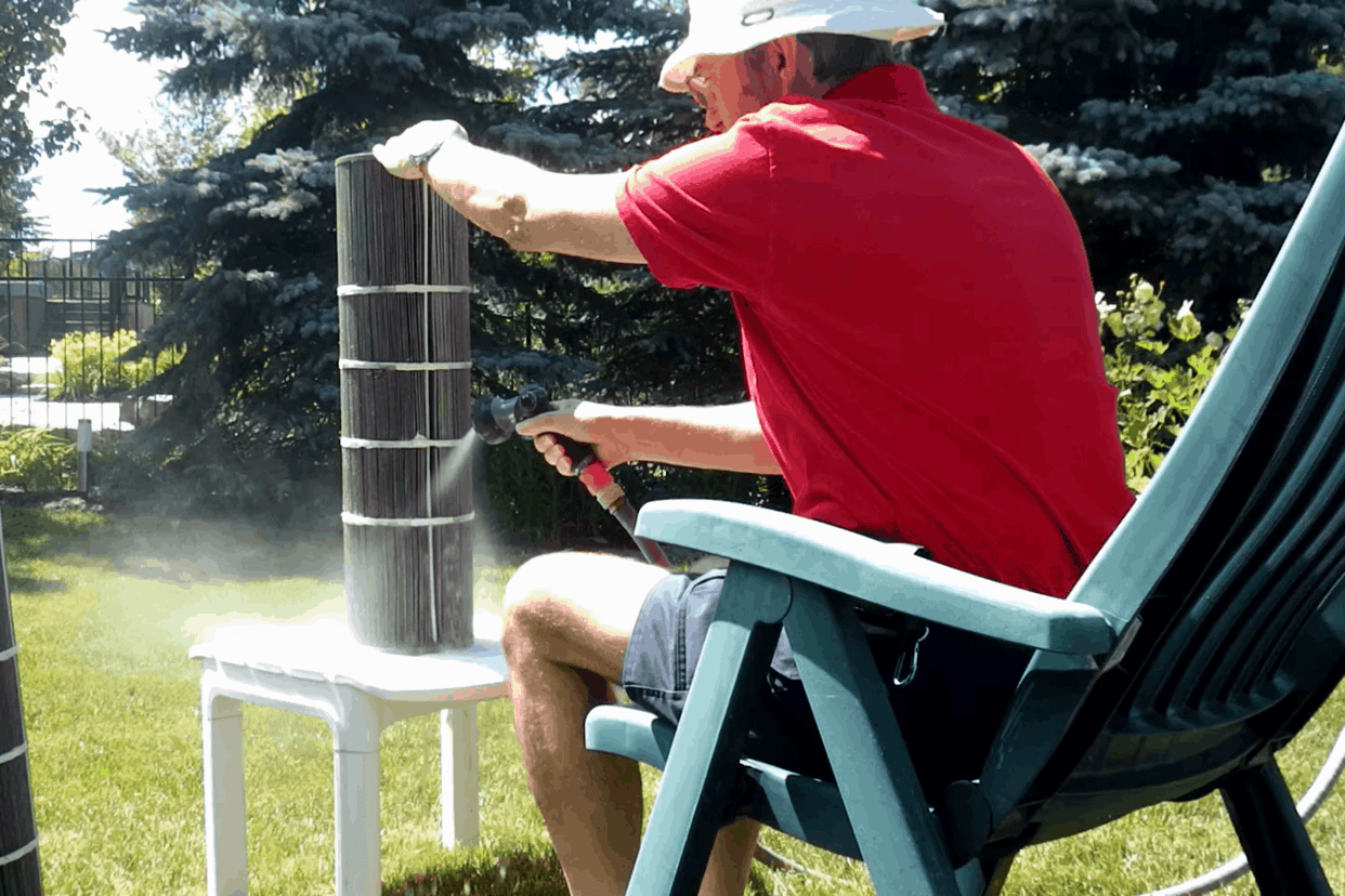 The instructions that came with my filter suggested washing it with a hose with no nozzle. The local pool store apparently uses a pressure washer which wears away and breaks the straps that hold the pleats in place. My compromise is to use a hose nozzle that directs the water stream down at an angle. I set the cartridge on a stool and I sit on a chair. I then hold the cartridge upright with one hand and direct the stream of water from top to bottom, cleaning a 1″-2″ stripe down the cartridge.