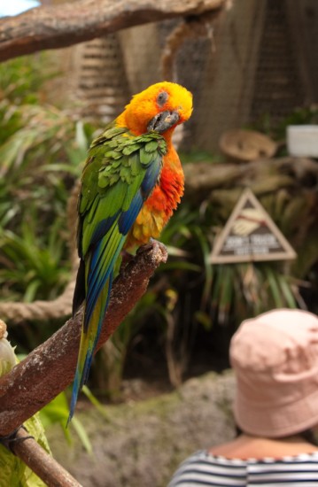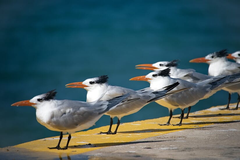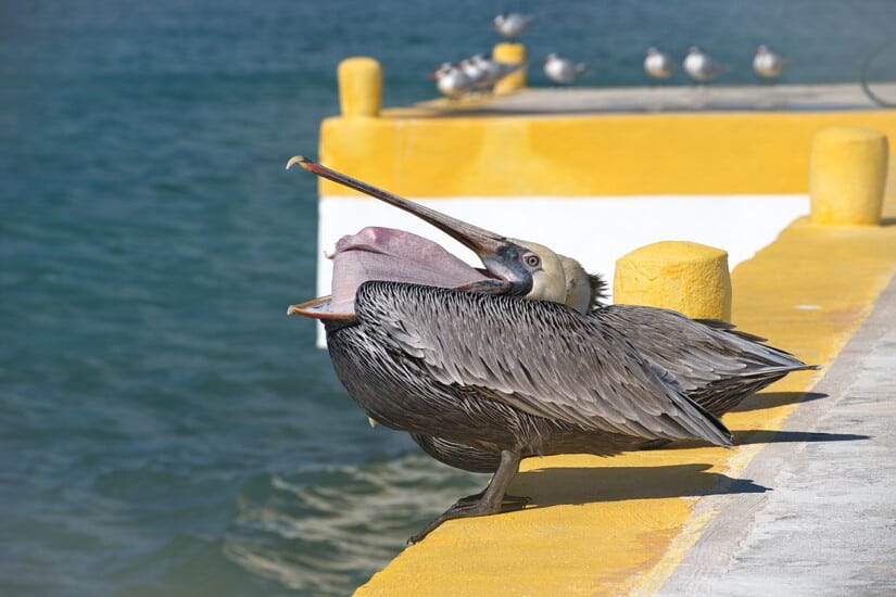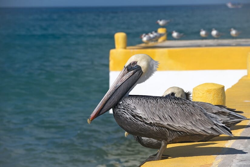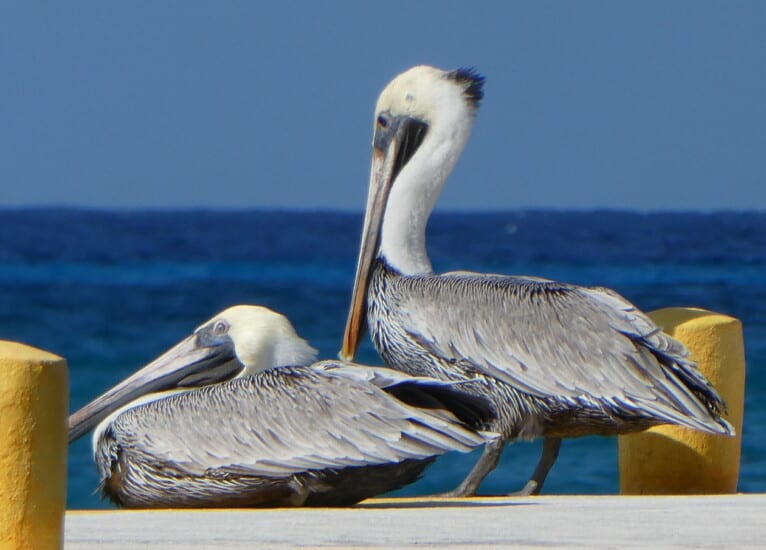 On our cruise vacation, we went ashore at Costa Maya mostly to re-visit Aviarius, an aviary in multiple rooms built above the shops, and joined by suspension bridges. Last time we were there, we got to feed the birds with provided bird food, but they have stopped doing that. Still a very nice way to spend an hour or two. Then the next day we hit Cozumel, which was our designated beach day, and there was a bonus – pelicans and Royal Terns, just sitting on the dock. So I went to sit with them, and later caught some other pelicans doing a fly-by. So this post is for my birder friends who can probably put up with 30 photos showing nothing but birds. Enjoy!