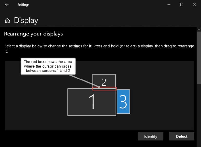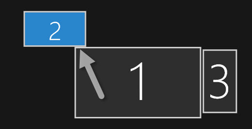 When you have more screens defined than you have active, it’s possible to run the mouse off an active screen into a phantom screen. Normally, you would set up the “Rearrange your displays” diagram so that it physically matches the hardware set-up. Logically I would put the TV to the right of my vertical screen so that mouse movement would naturally flow across the screens. However, I found that too often I would move the cursor too far and lose it. I prefer to “put” the TV somewhere that isn’t on the normal flight path of the mouse cursor. Where there is no adjacent screen, the mouse cursor just stops if you go too far. Something I discovered was that screens don’t have to be lined up corner to corner. I experimented with just a tiny space where the cursor could “escape”, like these, for example: