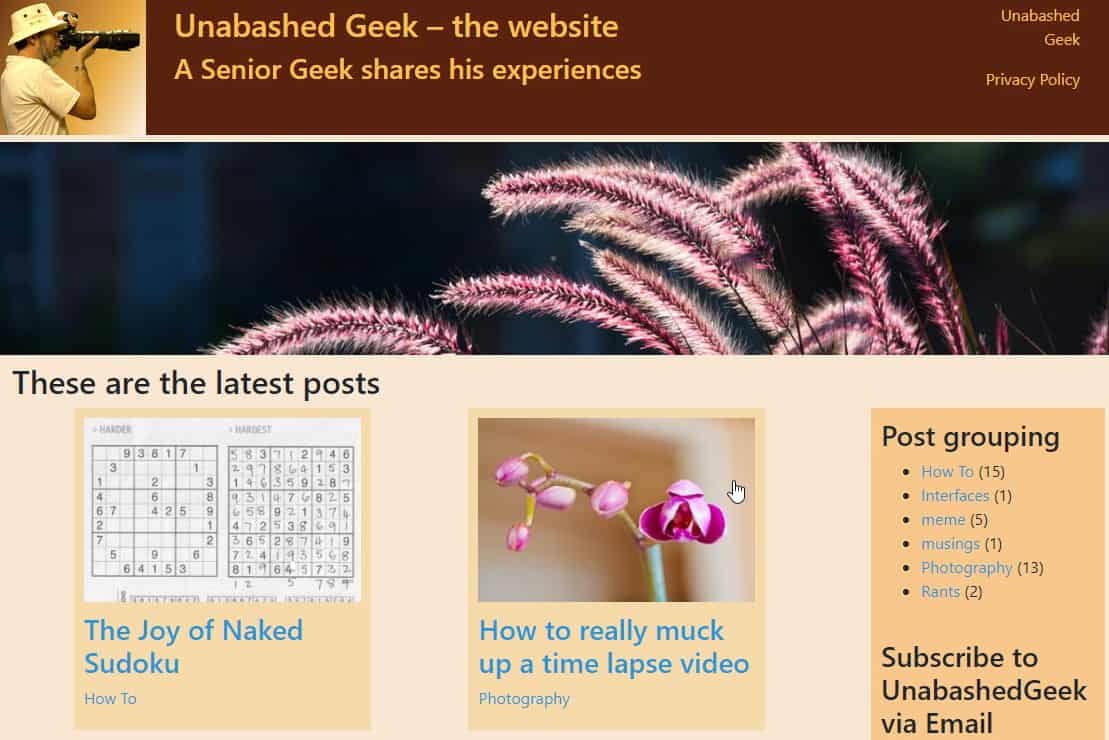 My main design criteria is to make mobile a good experience, and secondly to encourage viewers to stay and look at other posts, and to share their experiences on other social media. If I do this well enough, and have good enough content, I’ll get a larger audience and then possibly I’ll get to the point where ad revenue will begin to pay some of the bills for hardware, software and hosting.