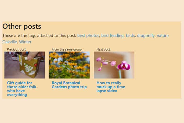 I also wanted to offer the viewer the choice of next, previous or previous in the same category. So if she got to my site via a “Photography” post, I could offer another Photography post as an option at the end of the post. Once I got that working, I found the need to test whether the previous post and the previous post in the same category were in fact the same post, and suppress the category link in those cases.